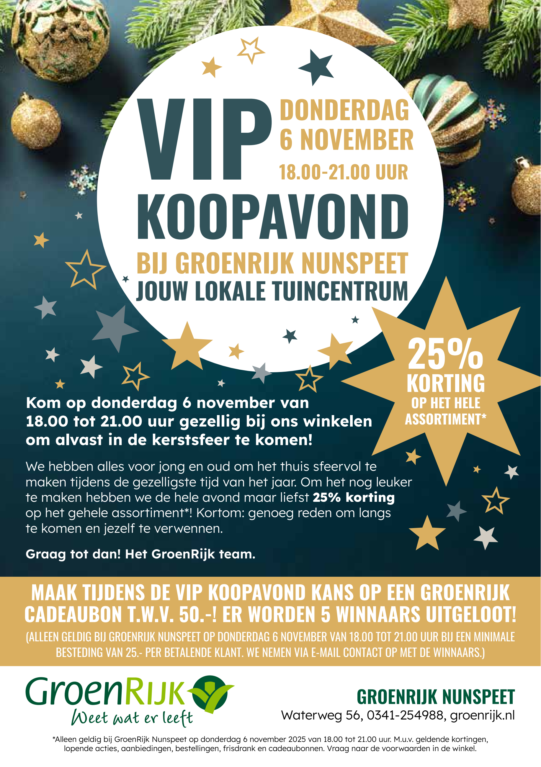 Tuincentrum GroenRijk Nunspeet organiseert donderdagavond 6 november een sfeervolle VIP kerstkoopavond.