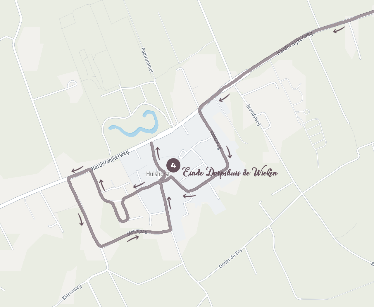 - Rondrit Hulshorst: Harderwijkerweg – Braambosch, Vlakken Eng, Tripklomp, Doornenkamp, LA naar Harderwijkerweg, RA Harderwijkerweg, Ra Akkerweg, Kapelweg, einde Dorpshuis de Wieken.