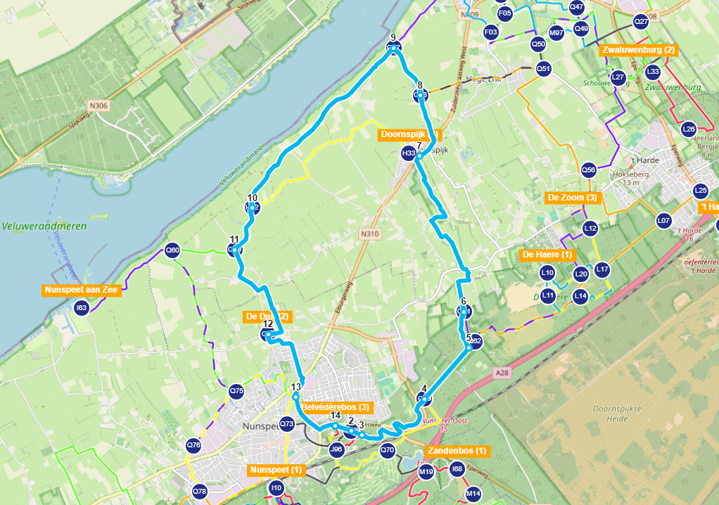 Deze blauwe wandeling van 18,6 km kun je starten op verschillende punten in Nunspeet, en staat aangegeven op de wandelpanelen bij het Belvédèrebos en bij Molen de Duif. De wandeling gaat naar Doornspijk en langs de Veluwemeerkust. Het grootste deel van de wandeling gaat door landelijk gebied, waar je zult genieten van weidse uitzichten, rustieke boerderijtjes, uitzicht over het Veluwemeer en weidevogelgebieden.